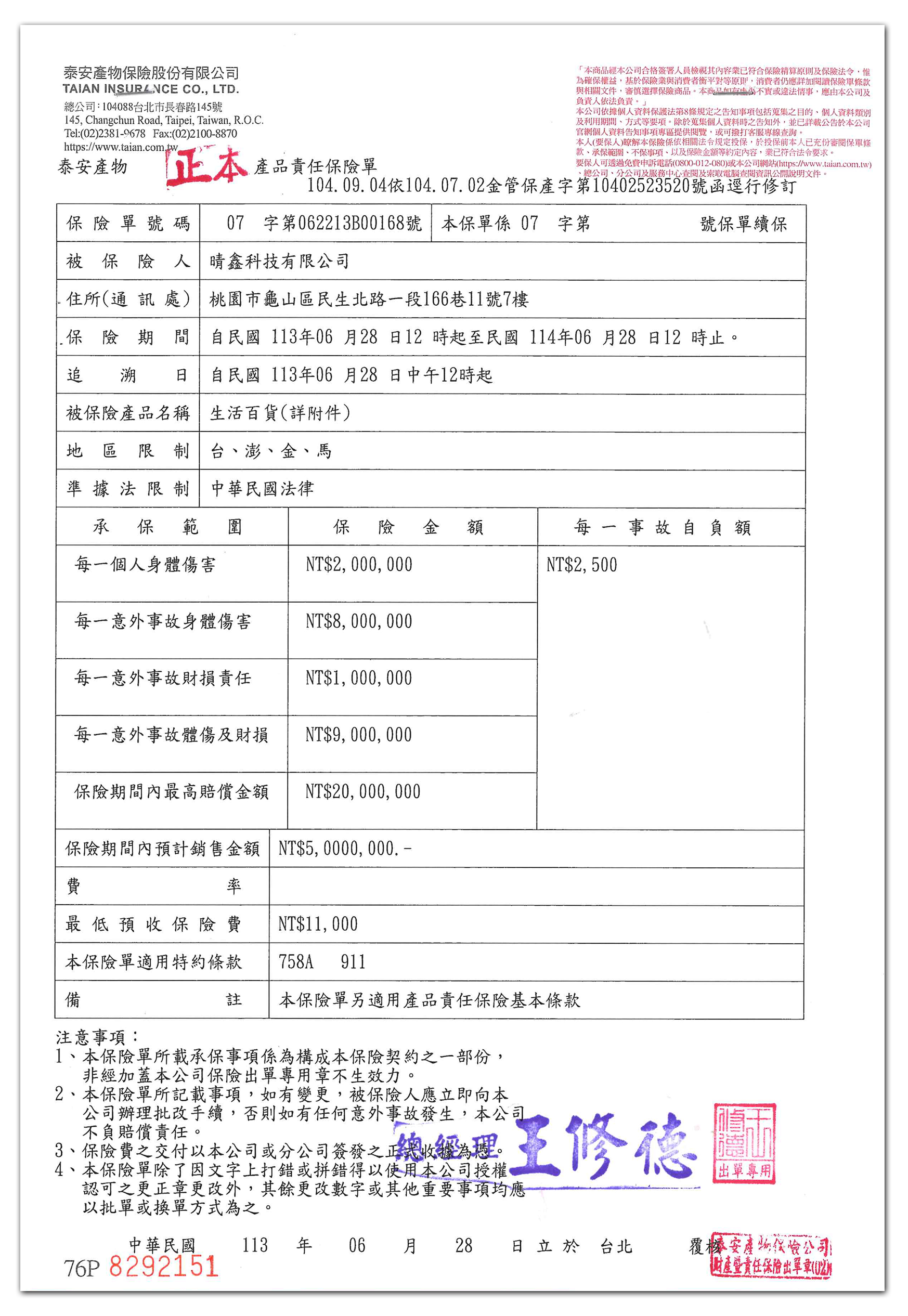 樂購晴鑫投保2000萬產品責任險,安泰產物保險股份有限公司承保在案,保單號碼07-062213B00168號。